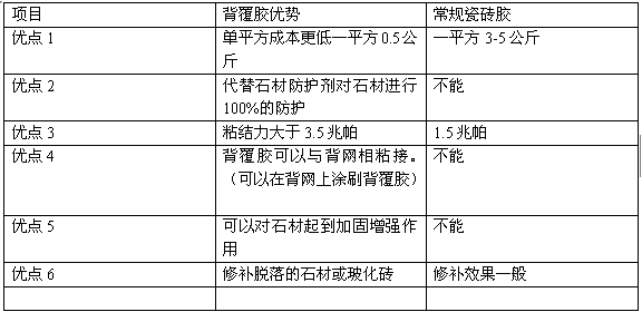 5.涂膠要求:背覆膠要一次涂滿,不要有漏刷的地方,否則要間隔12小時再涂刷第二遍。涂刷的石材必須是裸石。(未經防護劑處理的石材)